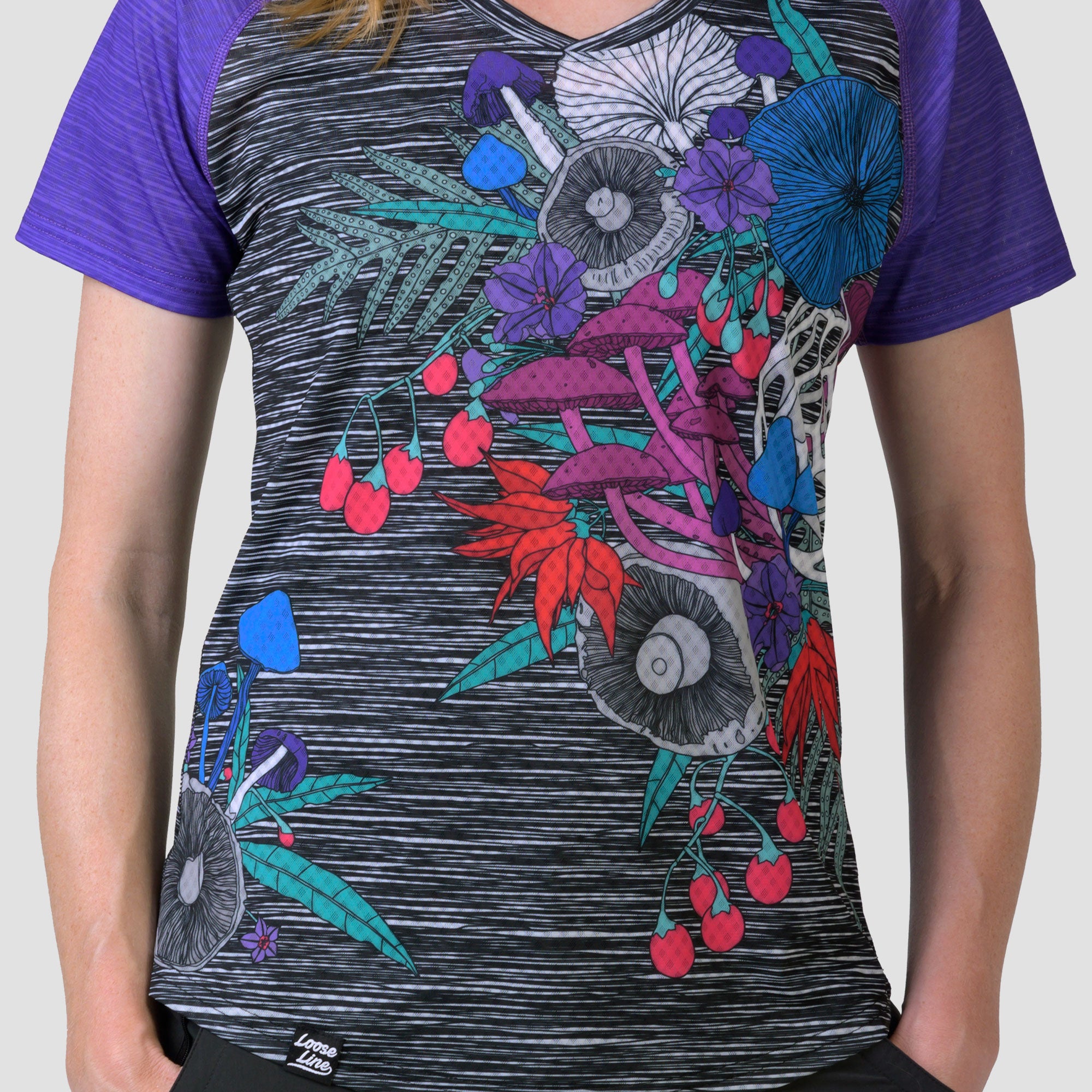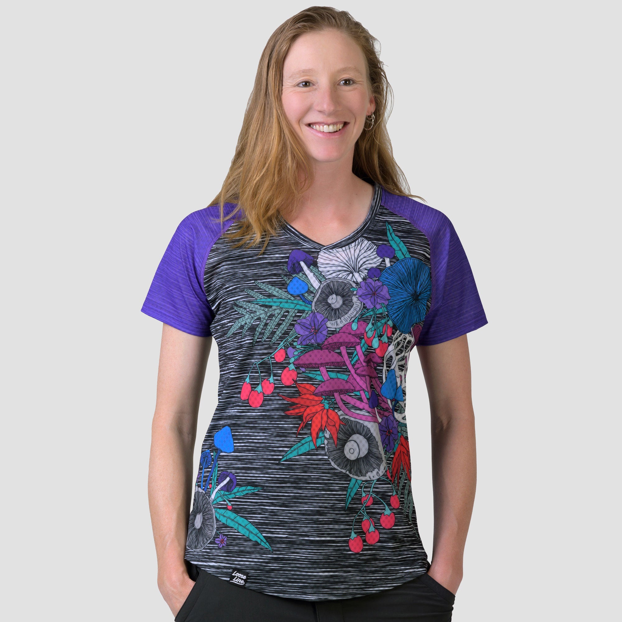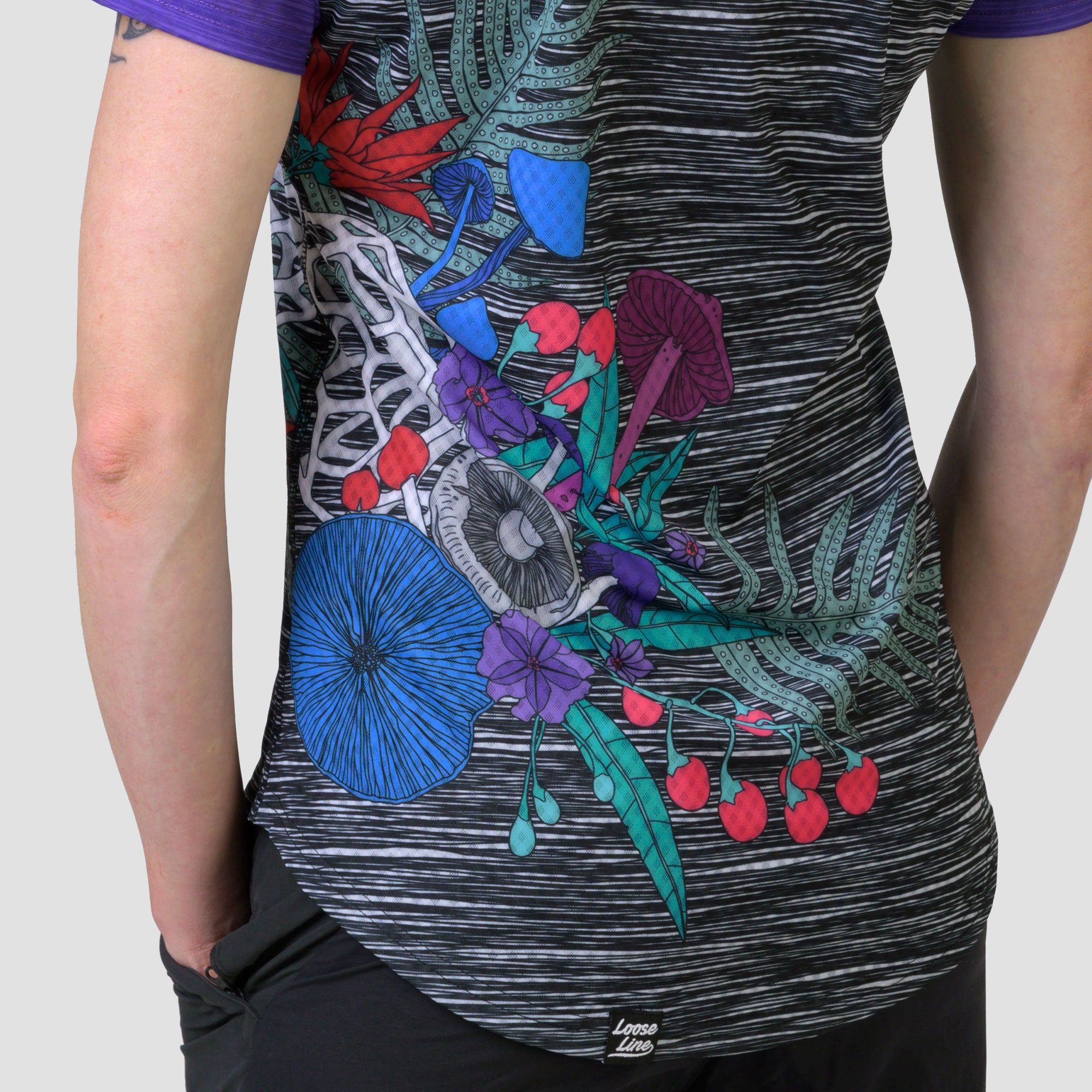 We've been inspired by riding and hiking around Aotearoa, and have decided to bring the native to you. This top was inspired by the awesome NZ fungi on our local trails and the blue fungi on our $50 note. We also added in some other cool native fauna that we come across while exploring our NZ paradise. The graphics are hand drawn and complemented with a palette of bold bright colours.
